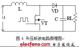 升壓斬波電路原理圖如圖4所示。當(dāng)控制器輸出脈沖高電平時(shí),開關(guān)管VT導(dǎo)通,電感L儲(chǔ)存能量,在ton時(shí)間內(nèi)電感電流增量為 。當(dāng)控制器輸出低電平時(shí),開關(guān)管VT截止,電感L向電容C充電并向負(fù)載提供能量,在Ioff 時(shí)間內(nèi)電感減少的電流量為 ,當(dāng)電路工作于穩(wěn)定狀態(tài)時(shí),有 ,可得為占空比),因?yàn)?,所以輸出電壓高于輸入電壓,電路實(shí)現(xiàn)升壓,設(shè)計(jì)中只要調(diào)節(jié)占空比的大小就可以改變輸出電壓的大小。