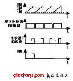 該芯片的最高工作頻率為300kHz ,實(shí)際工作頻率由引腳5、6 所接的電阻與電容決定,其振蕩頻率算式為f = 1.1/(RTCT ) ,本設(shè)計(jì)選擇的振蕩頻率為50kHz ,鋸齒波在片內(nèi)被送到比較器1 和2 的反相端,鋸齒波與片內(nèi)的誤差放大器的輸出在PWM 比較器2 中比較,而死區(qū)控制電平與鋸齒波在死區(qū)時(shí)間比較器1 中比較,兩者的輸出分別為一定寬度的矩形波,它們同時(shí)送到或門電路,經(jīng)分頻器分頻后,再經(jīng)相應(yīng)的門電路去控制內(nèi)部三極管導(dǎo)通,VT1和VT2同時(shí)導(dǎo)通或截止,從而控制開關(guān)管的導(dǎo)通與截止。其工作波形如圖6 所示。