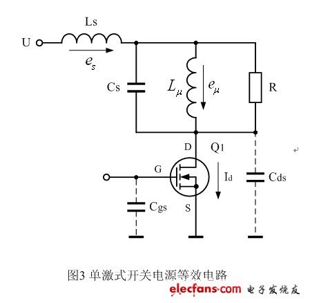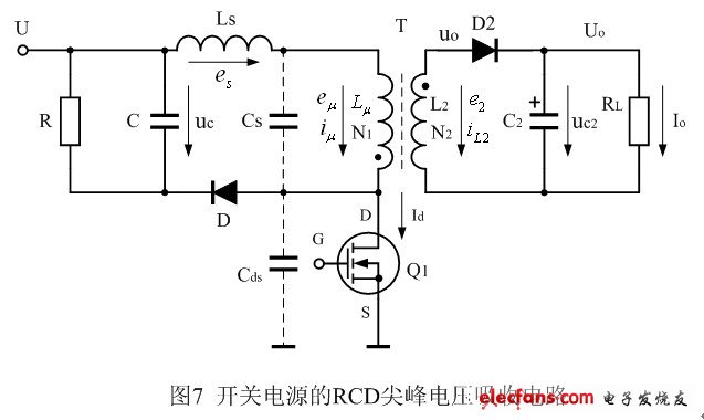 但在實際消磁過程中,由于變壓器初、次級線圈存在漏感,流過次級線圈N2的電流 并不能完全使變壓器鐵芯進行退磁,即,變壓器鐵芯中儲存的,未被電流 退磁的一部分磁能量,將會通過漏感Ls產(chǎn)生的反激電壓脈沖,在變壓器初級線圈回路中產(chǎn)生電流來釋放。此時,如果反激脈沖電壓 泄放回路的等效電阻(圖中未畫出)很大,將會在漏感Ls或等效電阻R兩端產(chǎn)生非常高的反激輸出電壓。在圖3或圖7中,電源開關(guān)管D、S極兩端的等效電容Cds(實為等效電阻Rds),就相當(dāng)于漏感Ls產(chǎn)生反激脈沖電壓 泄放回路的等效電阻。