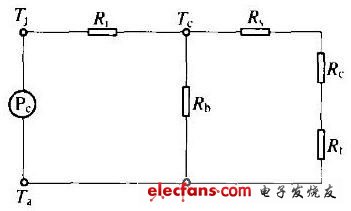 由于散熱器是開關(guān)電源的重要部件,它的散熱效率高與低關(guān)系到開關(guān)電源的工作性能。散熱器通常采用銅或鋁,雖然銅的熱導(dǎo)率比鋁高2倍但其價(jià)格比鋁高得多,故目前采用鋁材料的情況較為普遍。通常來講,散熱器的表面積越大散熱效果越好。散熱器的熱阻模型及等效電路如上圖所示