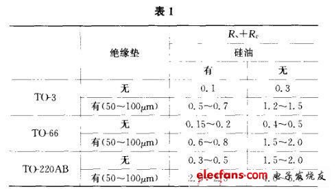 絕緣墊是用于半導(dǎo)體器件和散熱器之間的絕緣。絕緣墊的熱阻抗θs取決于絕緣材料的材質(zhì)、厚度、面積。下表中列出幾種常用半導(dǎo)體封裝形式的θs+θc