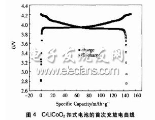 圖4是經(jīng)過了極片制備工藝、裝配工藝和封口工藝優(yōu)化后的CLIB充放電曲線。由圖可知,經(jīng)過配膏、攪拌、干燥溫度、干燥時(shí)間、壓片、裝配、封口等工藝優(yōu)化后,C/LiCoO2扣式電池已經(jīng)由原來只能充電、不能放電變成了可充可放的充電電池。