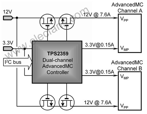 在ATCA構(gòu)架中,每個(gè)Carrier Blade設(shè)備都包括多達(dá)8個(gè)AMC模塊,而這些模塊均需熱插拔保護(hù)。載波板為每個(gè)AMC模塊提供了兩個(gè)主要電源:一個(gè)3.3V管理電源以及一個(gè)12V有效負(fù)載電源。