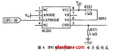 圖4所示為驅(qū)動(dòng)電路,該電路的作用就是把單片機(jī)輸出的SPWM驅(qū)動(dòng)信號(hào)經(jīng)過(guò)光耦隔離并適當(dāng)放大,然后送到IPM模塊的相應(yīng)管腳,進(jìn)而控制IPM內(nèi)部IGBT的開(kāi)通和關(guān)斷。光耦主要用來(lái)實(shí)現(xiàn)主電路和控制電路之間的信號(hào)連接,滿足主電路和控制電路之間的電氣隔離。本設(shè)計(jì)中選用HP公司的光耦HCPL-4503,該芯片有效地起到信號(hào)隔離和電壓放大作用,完成驅(qū)動(dòng)IPM的目的。