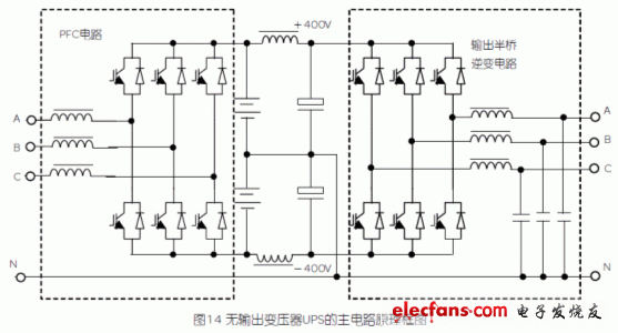 無輸出變壓器UPS視設(shè)計(jì)功率的大小,所用的具體電路形式也不盡相同,這里僅就大功率無輸出變壓器UPS的主電路結(jié)構(gòu)形式(見圖14)來討論它是如何完成三相四線輸出和系統(tǒng)升壓功能的,因?yàn)橐笕嗨木€輸出和系統(tǒng)升壓是傳統(tǒng)UPS必須帶輸出變壓器的兩個(gè)根本理由。當(dāng)新的電路拓樸結(jié)構(gòu)本身具備這兩個(gè)功能時(shí),輸出變壓器也就自然沒有存在的必要了。