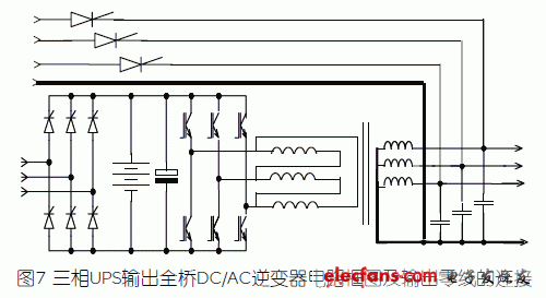 圖7為三相UPS輸出的全橋DC/AC逆變器電路框圖。為了滿足負(fù)載必須有零線的要求,于是就增加一個(gè)輸出隔離變壓器,變壓器的初級(jí)做三角型連接,由三相全橋的三個(gè)橋臂中點(diǎn)做三相線電壓輸入,變壓器次級(jí)星型連接,產(chǎn)生新的零線按三相四線制向負(fù)載供電。
