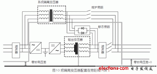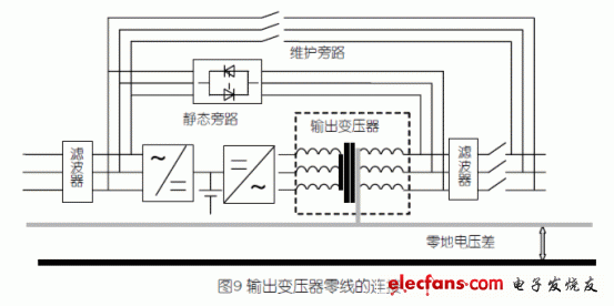 在UPS供電系統(tǒng)中,UPS設(shè)備的一個(gè)至關(guān)重要的功能是當(dāng)輸出過載或者UPS逆變器故障時(shí),自動(dòng)轉(zhuǎn)靜態(tài)旁路供電,另外,在系統(tǒng)中還設(shè)置了維護(hù)旁路,當(dāng)UPS需要維護(hù)時(shí)可手動(dòng)轉(zhuǎn)維護(hù)旁路向負(fù)載供電。執(zhí)行這兩個(gè)操作時(shí),都是由旁路輸入三相四線電壓直接向負(fù)載供電,所以系統(tǒng)的零線與負(fù)載端的零線必須短接在一起。這就決定了帶輸出變壓器的UPS的變壓器次級(jí)新產(chǎn)生的零線必須連接到輸入電源系統(tǒng)的零線上,如圖9所示。也就是說,UPS機(jī)內(nèi)的變壓器沒有電源系統(tǒng)隔離的功能,如果系統(tǒng)存在零-地電壓差較大的問題,UPS機(jī)內(nèi)的逆變器輸出變壓器對(duì)此電壓差是無能為力的。