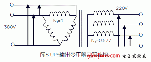 在實(shí)際應(yīng)用中,輸出變壓器通常采用圖8的接法,變壓器初級(jí)是三角型,對(duì)于沒有升降壓作用的隔離變壓器,三個(gè)初級(jí)線圈的電壓都是380V,次級(jí)是星型,三個(gè)次級(jí)線圈的電壓都是220V,那么初次級(jí)線圈的匝比應(yīng)該是:N1: N2=1:0.577。