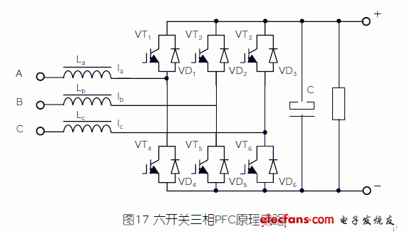 六開關(guān)三相PFC是由六只開關(guān)功率器件組成的三相PWM整流電路,圖17是其原理電路。每個(gè)橋路由上下兩只開關(guān)管及與其反向并聯(lián)的二極管組成,每相電流可通過該相橋臂上的這兩只開關(guān)管控制。如A相電壓為正時(shí),VT4導(dǎo)通使電感La上電流ia增大,電感La充電儲(chǔ)能;VT4關(guān)斷時(shí),電感La感應(yīng)電壓疊加在輸入電壓UA上(升壓),使與VT1并聯(lián)的二極管VD1導(dǎo)通,電流ia通過VD1流向負(fù)載,在電感能量釋放過程中電流ia逐漸減小。同樣A相電壓為負(fù)時(shí),可通過VT1和VT4反并聯(lián)的二極管VD4對(duì)電流ia進(jìn)行控制。