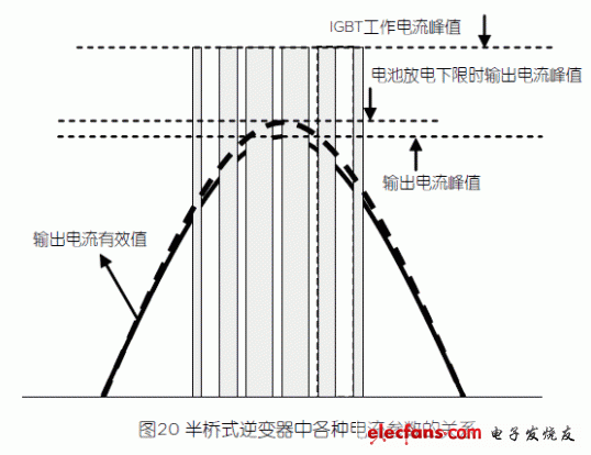 在無輸出變壓器UPS中,以輸出半橋逆變器對(duì)IGBT的性能要求最高,圖20表示了半橋逆變器中各種電流參數(shù)的關(guān)系。