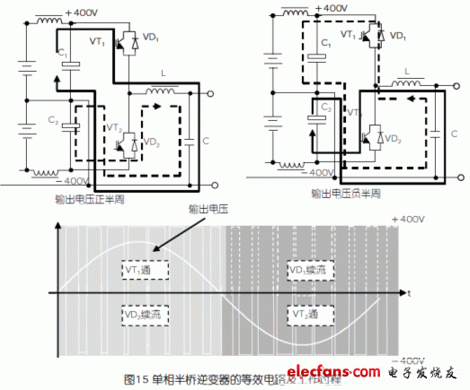 如圖15所示,假定橋臂的上面的IGBT用VT1和VD1表示,下面的IGBT用VT2和VD2表示,與電池并連的電容分別是C1和C2,續(xù)流電感為L(zhǎng)。