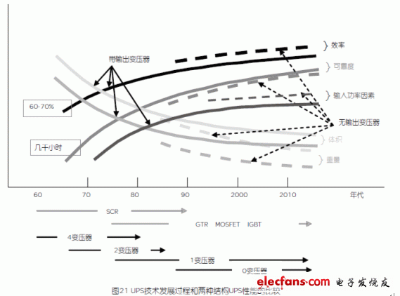 2, 定性的表達(dá)了無變壓器UPS在效率、體積、重量、輸入功率因數(shù)等指標(biāo)的優(yōu)勢(shì)。