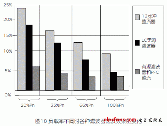 表1是輸出滿負(fù)載時(shí)的數(shù)據(jù),當(dāng)實(shí)際應(yīng)用中負(fù)載減輕時(shí),12脈沖(+11次無源濾波)的輸入功率因數(shù)會(huì)明顯地減小,輸入電流諧波成分明顯增大(見圖18),對(duì)電網(wǎng)污染和要求系統(tǒng)前端設(shè)備容量增大的影響也就更嚴(yán)重。