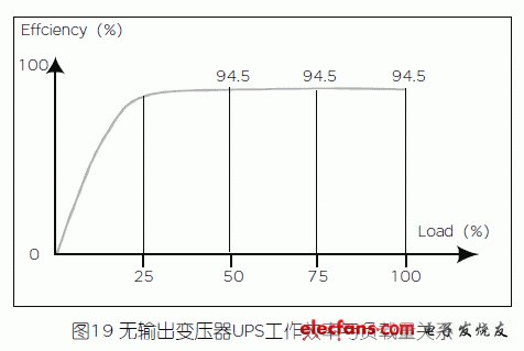 值得注意的是,在實(shí)際使用中,特別是在(1+1)冗余并機(jī)和雙總線的配置系統(tǒng)中,UPS的實(shí)際輸出負(fù)載率只有30-40%,這時(shí)的UPS的工作效率更有實(shí)際意義。在這方面無輸出變壓器UPS同樣顯示了它的優(yōu)勢(shì),如圖19所示。