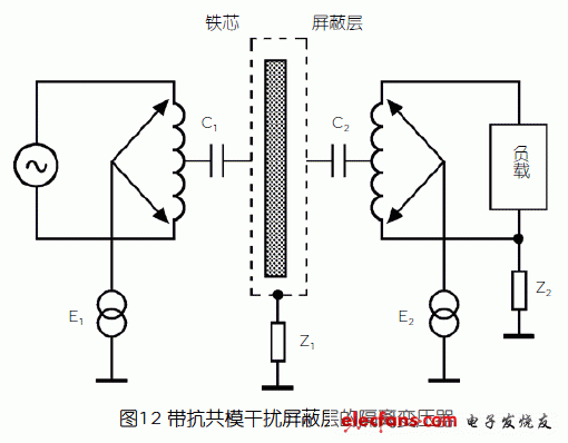 圖12中,C1為初級(jí)繞阻與屏蔽層之間的分布電容, C2為次級(jí)繞阻與屏蔽層之間的分布電容,Z1為屏蔽層接地阻抗,Z2為負(fù)載的對(duì)地阻抗,E1為初級(jí)干擾(共模型)電壓,E2為E1通過偶合傳導(dǎo)到次級(jí)的干擾(共模型)電壓。如果C1和C2的阻抗遠(yuǎn)大于屏蔽層接地阻抗,則偶合傳導(dǎo)到次級(jí)的干擾電壓E2就會(huì)遠(yuǎn)小于E1。