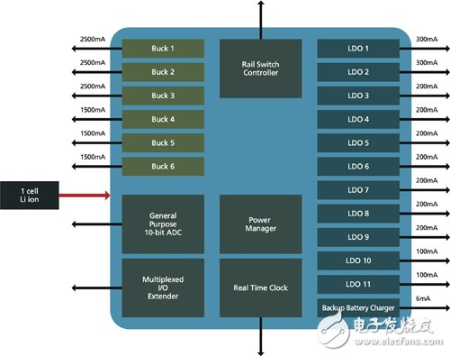 為何要擁有和行動裝置上的所有通訊、多媒體及周邊處理電路高度整合在一起的輔助PMIC,其中有許多好理由。這顆PMIC必須能夠負荷高達叁十組不同的供應(yīng)電源,提供給應(yīng)用處理器與基頻處理器的各個部分,并正確組合電壓與電流。假如消費者的電源管理嵌在晶片上,由應(yīng)用處理器來處理這些任務(wù)時,則需要有一個高電流能力的電源供應(yīng),而這僅能透過匯整許多接腳來達成。系統(tǒng)單晶片(SoC)的設(shè)計工程師可以使用晶片外的專用輔助PMIC,來提供個別低電壓、低電流電源軌,如此可避免晶片上電源管理設(shè)計方式額外產(chǎn)生晶粒及成本效益。