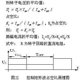 設(shè)三相整流濾波后的直流電壓為UE,IGBT導(dǎo)通時(shí)間為TON,截止時(shí)間為TOFF。導(dǎo)通時(shí),轉(zhuǎn)子兩端壓降為UE; 截止時(shí),轉(zhuǎn)子電壓等于續(xù)流二極管D7管壓降,忽略為零。如圖三所示。
