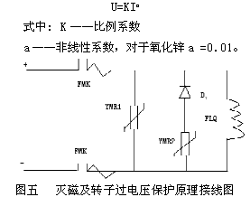該回路由高能氧化鋅壓敏電阻組件和專用快速直流開關(guān)為主組成。滅磁及轉(zhuǎn)子過電壓保護(hù)原理接線圖如圖五所示。圖中YMR表示氧化鋅壓敏電阻,它是一種非常優(yōu)良的非線性元件,其電壓與電流關(guān)系可用下式描述: