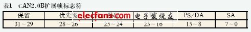 此系統(tǒng)采用CAN2.0B的數(shù)據(jù)幀,有29位標(biāo)志符,占4字節(jié)的長(zhǎng)度。定義見(jiàn)表1。
