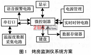 首先擬定監(jiān)測儀的系統(tǒng)方案。監(jiān)測儀主要由微控制器、顯示、語音報警、實時時鐘、外掛存儲器、串口、溫濕度數(shù)據(jù)采集電路以及鍵盤、電源幾部分組成,如圖1所示。