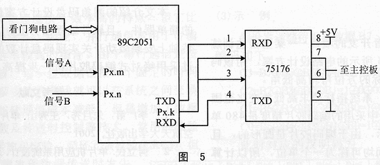 信號處理電路產(chǎn)生的方波信號A、B由端口Px.m和Px.n輸入,然后通過軟件比較端口現(xiàn)在時刻和下一時刻的狀態(tài)變化,實(shí)現(xiàn)功能選擇。最后,通過端口Px.k控制的串行通信 芯片75176傳給主控板,實(shí)現(xiàn)信號的控制傳輸。