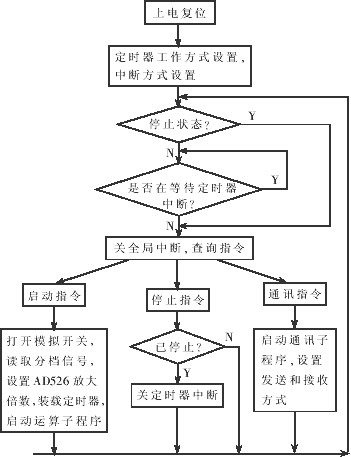 監(jiān)控系統(tǒng)的整個(gè)程序主要由主程序、三個(gè)中斷處理程序、兩個(gè)計(jì)算程序組成。完成的主要功能是:系統(tǒng)復(fù)位后的初始化、控制采樣、進(jìn)行A/D轉(zhuǎn)換、根據(jù)采樣值進(jìn)行信號(hào)處理、選擇放大倍數(shù)(量程)、控制通訊接口傳送數(shù)據(jù)等。主程序流程圖如圖6所示[5]。