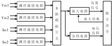 調(diào)理好的信號(hào)通過多路模擬開關(guān)進(jìn)行逐一選定和處理。信號(hào)通過模擬開關(guān)后,一路進(jìn)入分檔電路測(cè)定范圍,另一路進(jìn)入放大單元放大到合適的工作范圍。
