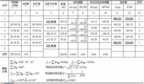 下面是一個閉合導線坐標計算表: