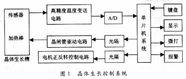 晶體生長控溫系統(tǒng)如圖1所示,高精度溫度?變送器把檢測到的微弱溫差信號放大后經(jīng)A/D轉(zhuǎn) 換 ,由單片機系統(tǒng)進行數(shù)據(jù)采集和分析處理,一方面由LED顯示現(xiàn)場采集溫度值,另一方面把 該采集信號與鍵盤設置的溫度值進行比較,提取溫差量及溫差變化量,作為智能控制的輸入 參數(shù)。輸出量控制晶閘管驅(qū)動電路,進一步控制加熱棒的功率,達到控溫目的。由于晶體生 長是在旋轉(zhuǎn)運動下進行的,因此,整個載晶裝置由一可逆電機控制其旋轉(zhuǎn)過程。此外系統(tǒng)還 設計了微打接口及溫度越限聲光報警電路。