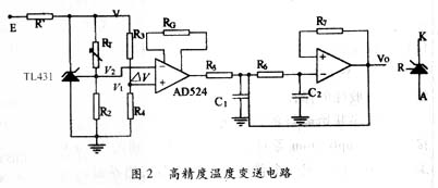 選擇AD524作為溫度變送器的放大電路,其增益可由外接電阻RG調(diào)整,RG的溫度效應將 引起AD524放大倍數(shù)漂移或精密度等級下降,在高精度控溫系統(tǒng)中,必須對增益電阻的溫度 效應進行補償,具體設計方法見文獻[2]。