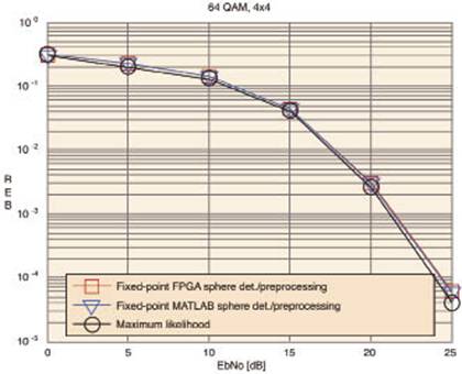 我們使用針對DSP設(shè)計(jì)流程的賽靈思System Generator實(shí)現(xiàn)了完整的硬判鏈。設(shè)計(jì)驗(yàn)證工作不僅使用了MATLAB/Simulink 環(huán)境的仿真語義,還有System Generator的協(xié)同仿真功能。信道矩陣參數(shù)的同相部分和正交部分從正常的分布得出,并由MATLAB交付給System Generator建模環(huán)境。我們同樣使用這種仿真框架進(jìn)行了比特誤碼率計(jì)算。圖3對我們的定點(diǎn)硬判決設(shè)計(jì)BER曲線、浮點(diǎn)硬判決設(shè)計(jì)BER曲線和最佳ML參考曲線進(jìn)行了比較。我們通過對賽靈思ML510開發(fā)平臺進(jìn)行基于以太網(wǎng)的硬件協(xié)仿真,開發(fā)出了該設(shè)計(jì)的硬件演示。信道矩陣參數(shù)采用賽靈思AWGN IP核發(fā)送給球形檢測器。我們通過把設(shè)計(jì)嵌入到自同步BER測試器來計(jì)算BER。該儀器能夠向檢測器發(fā)送輸入并捕獲誤碼。