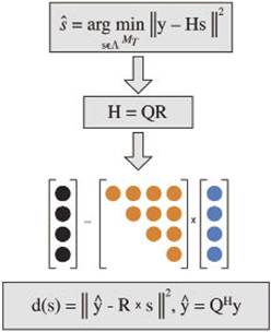 圖1顯示的是如何進(jìn)行數(shù)學(xué)轉(zhuǎn)換,得出計(jì)算部分歐幾里德距離度量法的最終表達(dá)式。歐幾里德距離度量法是球形檢測過程的基礎(chǔ)。R代表三角形矩陣,用于處理以矩陣元rM,M開始的可選符號的迭代法。其中,M代表信道矩陣以實(shí)數(shù)表達(dá)的維數(shù)。該解決方案通過M次迭代定義出遍歷樹結(jié)構(gòu),樹的每層i對應(yīng)第i根天線的處理符號。