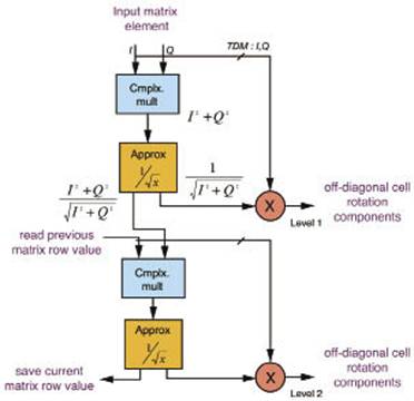 發(fā)送到非對角線單元中的數(shù)據(jù)是旋轉(zhuǎn)矢量的同相部分和正交部分除以相應(yīng)的近似值得出的結(jié)果。我們不僅通過在對角線單元和非對角線單元采用流水線架構(gòu)實(shí)現(xiàn)了高數(shù)據(jù)吞吐量,同時(shí)還通過對跨5個(gè)信道的硬件進(jìn)行時(shí)分復(fù)用的方式控制了近似值模塊和復(fù)雜乘法器引起的時(shí)延。
