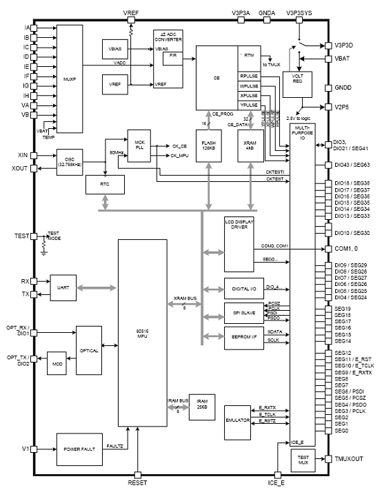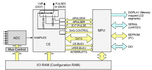 The integrated MPU core and 128 KB of Flash memory provides a flexible means of configuration, post-processing, data formatting, interfacing to host processor via a UART or SPI interface, displaying output data to an LCD, or using DIO pins for intelligent relay control. Complete firmware for common applications is available from Teridian and can be pre-loaded into the IC during manufacturing test. Alternatively, a complete array of ICE, development tools and programming libraries are available to allow customization MPU code for each application.