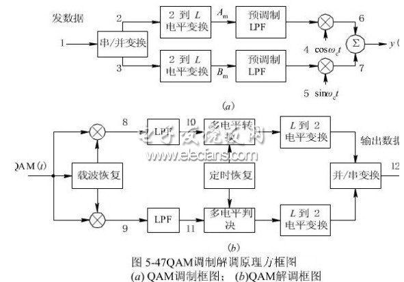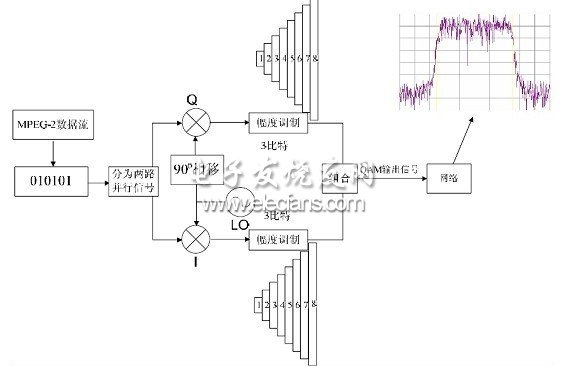 、Q調(diào)制和星座圖數(shù)據(jù)經(jīng)過信道編碼之后,被映射到星座圖上。下面討論星座圖的概念。圖1就是QAM調(diào)制器的基本原理框圖,這里包含幾個(gè)主要的概念: