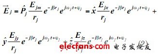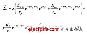 待測(cè)電場(chǎng)為向線極化,沿向傳播,式(1)中Epm是被測(cè)信號(hào)源處的電場(chǎng)強(qiáng)度值;rp是被測(cè)信號(hào)到測(cè)試點(diǎn)的距離;wp是被測(cè)信號(hào)的初始相位;wp是被測(cè)信號(hào)角頻率。