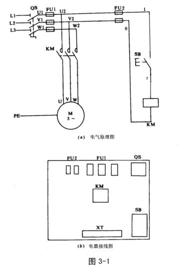 點(diǎn)動(dòng)正轉(zhuǎn)控制線路是用按鈕、接觸器來(lái)控制電動(dòng)機(jī)運(yùn)轉(zhuǎn)的最簡(jiǎn)單的正轉(zhuǎn)控制線路。所謂點(diǎn)動(dòng)控制是指:按下按鈕,電動(dòng)機(jī)就得電運(yùn)轉(zhuǎn);松開按鈕,電動(dòng)機(jī)就失電停轉(zhuǎn)。三相異步電動(dòng)機(jī)的點(diǎn)動(dòng)控制電氣原理圖如圖3-1(a)所示。點(diǎn)動(dòng)正轉(zhuǎn)控制線路是由轉(zhuǎn)換開關(guān)QS、熔斷器FU、啟動(dòng)按鈕SB、接觸器KM及電動(dòng)機(jī)M組成。其中以轉(zhuǎn)換開關(guān)QS作電源隔離開關(guān),熔斷器FU作短路保護(hù),按鈕SB控制接觸器KM的線圈得電、失電,接觸器KM的主觸頭控制電動(dòng)機(jī)M的啟動(dòng)與停止。