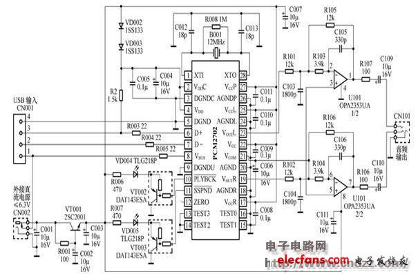 ??? PCM2702(IC1)為美國TI公司屬下的BB公司生產的USB接口DAC芯片。PCM2702支持