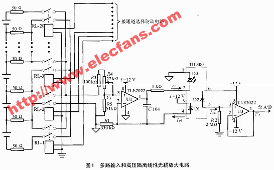 該電路對各路信號進行放大、校正,供A/D轉(zhuǎn)換使用。我們采用線性光耦合放大電路。線性光耦合器件TIL300的輸入輸出之間能隔離3500V的峰值電壓,可以有效地將測量通道與計算機系統(tǒng)隔離開來,使計算機系統(tǒng)避免測量通道部分較高電壓的危害,對信號放大的線性度也很好。