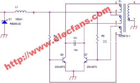 供一個高交流輸入阻抗,R4 R5為Q6 Q7提供基極直流偏置,變壓器T1有三個繞組,初級主繞組雙線并繞,中心軸頭3,4腳連接到電感L1,2腳和5腳連功率三極Q6和Q7的集電極,反饋繞組1腳和6腳連Q6和Q7的基極,由于開關(guān)管Q6 Q7的性能不可能完成一樣,所以在接通電源的瞬間,Vcc向開關(guān)管基極注入的電流也不可能絕對平衡,流經(jīng)兩開關(guān)管集電極的電流也不可能完全一致。設(shè)i1>i2,則變壓器的磁通大小與方向由i1決定,而磁通的變化在反饋繞組也產(chǎn)生響應(yīng)的感應(yīng)電勢,感應(yīng)電勢使變壓器反饋繞組的“.”(1腳)為負.由于反饋繞組的感應(yīng)電勢使Q7基極的電位下降,Q6的基極電位上升,從而對Q7形成負反饋,使Q7的集電極電流i2越小,對Q6形成正反饋,使Q6的集電極電流i1越大,合成磁通也越大,磁通的變化及感應(yīng)電勢的相互作用使Q6飽和導(dǎo)通,Q7截止.此時磁通達最大值,而與磁通變化率成呈正比的感應(yīng)電勢也為零.