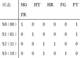 各狀態(tài)與信號燈的關(guān)系由表3給出,其中HG,HY,HR分別表示東西方向綠、黃、紅燈。FG,F(xiàn)Y,F(xiàn)R分別表示南北方向綠、黃、紅燈。