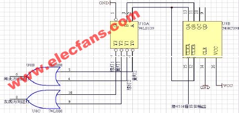 交通燈以上4種工作狀態(tài)的轉(zhuǎn)換時由控制器進(jìn)行控制的。為實現(xiàn)此功能,此設(shè)計選用74HC390計數(shù)器,雙2-4譯碼器74139,74HC390計數(shù)器。其電路如圖5所示。