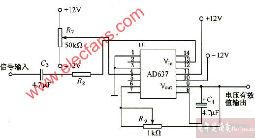 ⑴ 真有效值轉(zhuǎn)換器 選用高精度的AD637芯片(圖 16),其外圍元件少、頻帶寬,精度高于0.5%。