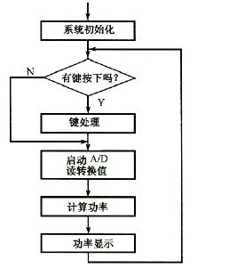 ⑶ 軟件設計 本系統(tǒng)用軟件設計了特殊功能鍵,通過對鍵盤的簡單操作,便可實現(xiàn)功率放大器輸出功率的直接顯示(以十進制數(shù)顯示),精確到小數(shù)點后4 位,顯示誤差小于4.5%。 本系統(tǒng)軟件采用結(jié)構(gòu)化程序設計方法,功能模塊各自獨立。軟件主體流程圖如圖17所示。