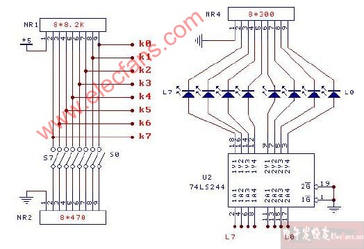 8位(八位)邏輯開關電路圖     安裝在操作部分的下部,由8個鈕子開關組成。電路如附圖1-5所示。