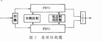 從圖2可以看出:該設(shè)計主要有切換控制、延遲時間控制、FIFO等組成部分。信號由輸入端進入器件,經(jīng)切換開關(guān),由切換控制選擇存儲FIFO,直接采樣存儲到不同的FIFO中去,由延遲控制器控制延遲時間,最后兩個FIFO的輸出相或得到輸出脈沖。