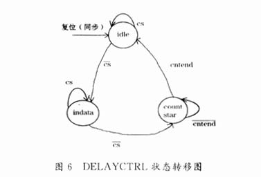 DELAYCTRL 延遲時間控制元件完成延遲時間的刷新和延遲時間的定時控制,由一個有限狀態(tài),計數(shù)器完成定時。定時計數(shù)器為簡單的16位計數(shù)器,設(shè)計比較簡單,在此不再贅述。這里只介紹一下延遲控制器的設(shè)計,其狀態(tài)轉(zhuǎn)移圖如圖6所示。延時控制器包括三個狀態(tài):空閑狀態(tài)(idle)、延遲時間刷新狀態(tài)(indata)、延時狀態(tài)(countstar)。