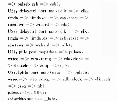 說明了上述元件包以后,可以根據(jù)頂層結(jié)構(gòu)圖將各元件連接起來,得到脈沖延遲電路的頂層描述VHDL語言代碼如下: