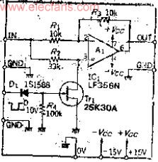 TT1導(dǎo)通后,OP放大器作為反相放大電路工作,根據(jù)-A=R3/R1,放大倍數(shù)A=1,TT1斷開后,因同相輸入端為高輸入阻抗,所以輸入信號(hào)未經(jīng)衰減而輸入,受OP放大器輸出的控制,使反相輸入端的電位成為正電位,在輸出電位與輸入電位相同時(shí),R1沒(méi)有電流流過(guò),此時(shí)本電路作為同相緩沖器工作。