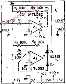 圖中所示是用通用II型F007運(yùn)放組成的精密限幅放大器線路.在限幅器中,限幅我曲線從線性到飽和是逐漸變化的,圖